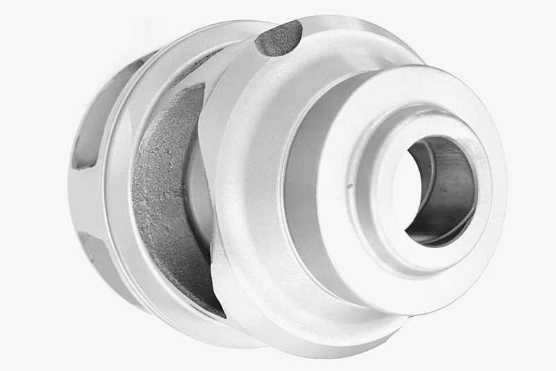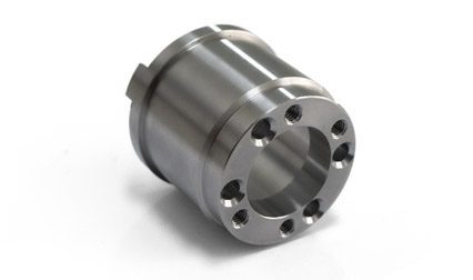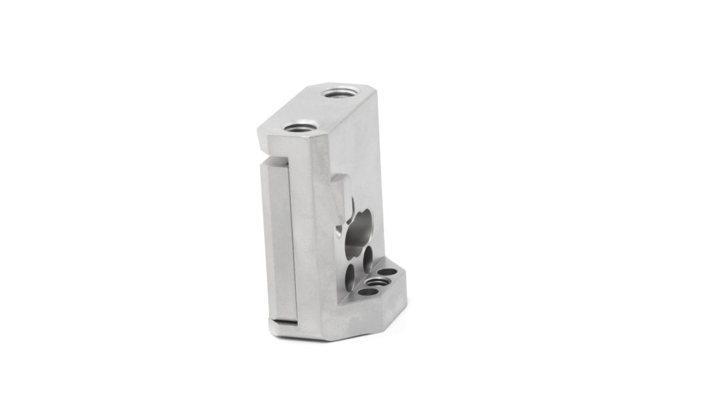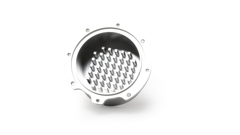 Machined parts are bead blasted with glass beads which results in a uniform grainy texture and reduced machining marks.